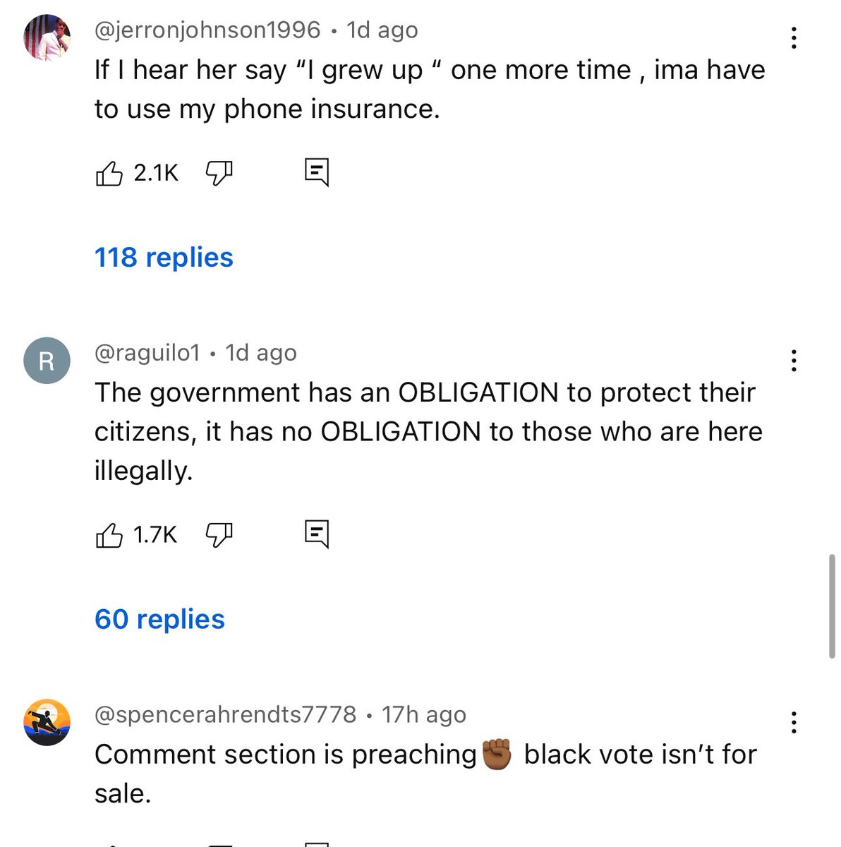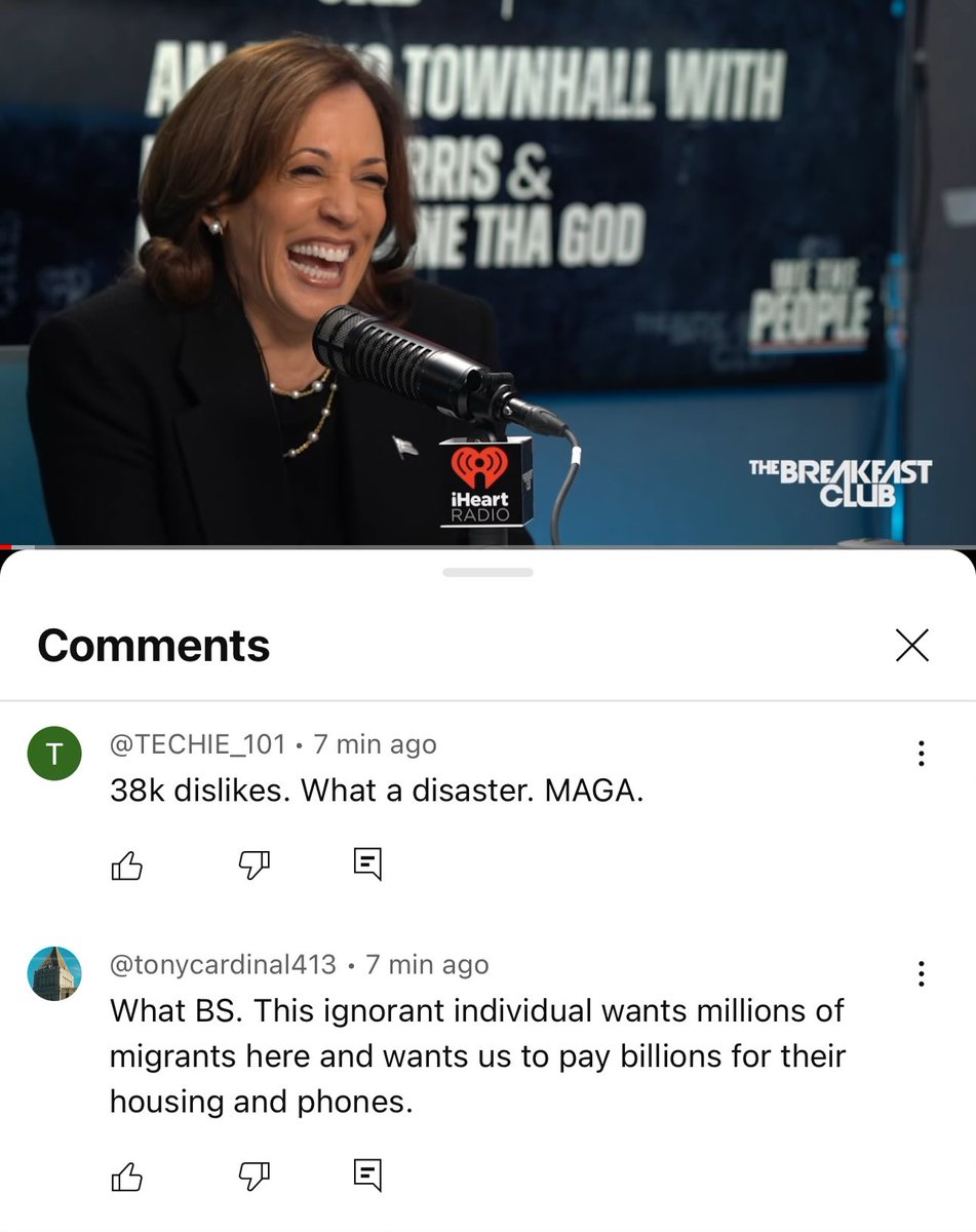 LEFT: Top comments from Kamala Harris’s most recent interview with Charlamagne. All negative.