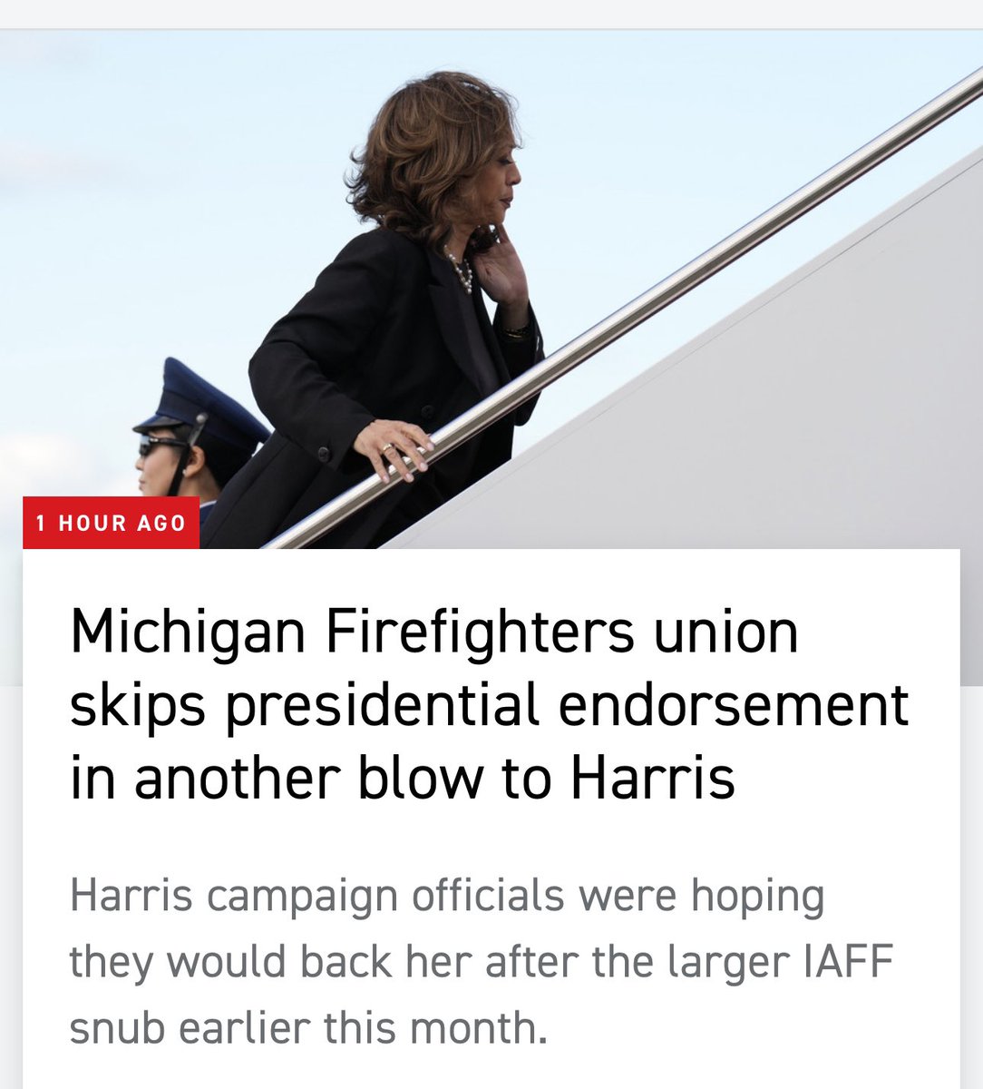 Somehow I missed this… While Kamala was doing a Michigan focused interview with Charlamagne, the Michigan firefighters union came out and said that they will not be endorsing her 😂🤣 https://t.co/D9UyMblAuD