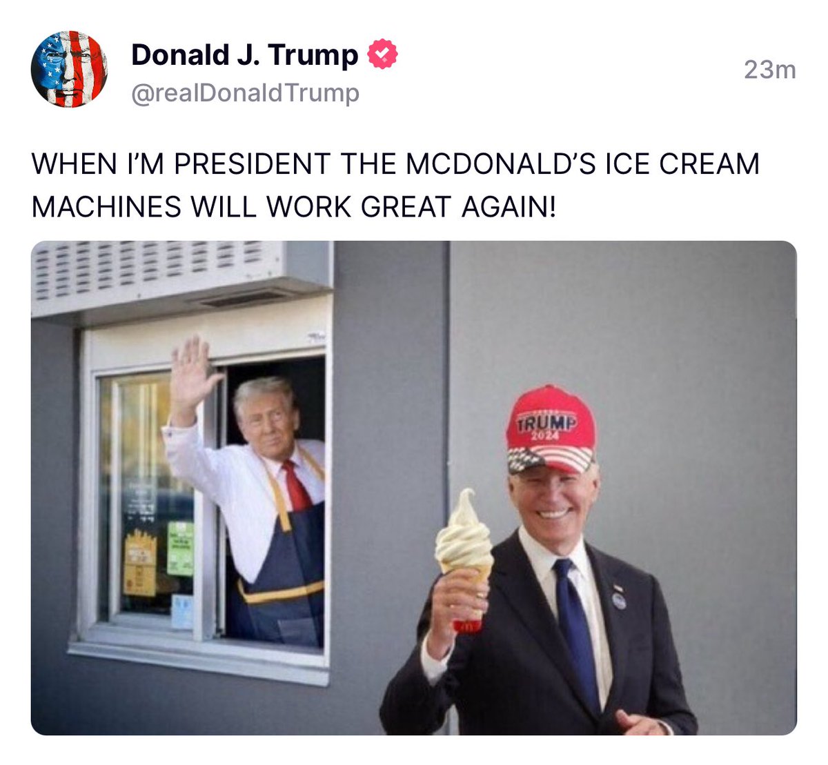“WHEN I’M PRESIDENT THE MCDONALD’S ICE CREAM MACHINES WILL WORK GREAT AGAIN!” https://t.co/OE0rZwxSoz