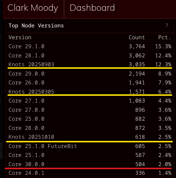 I now see 4 out of 68 peers identifying as Knots. 7 of these peers are relaying sub 1 vbyte txs; that seems wild to me.