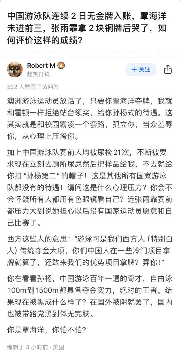 「奥运🇨🇳泳队成绩不佳因被西方霸凌」