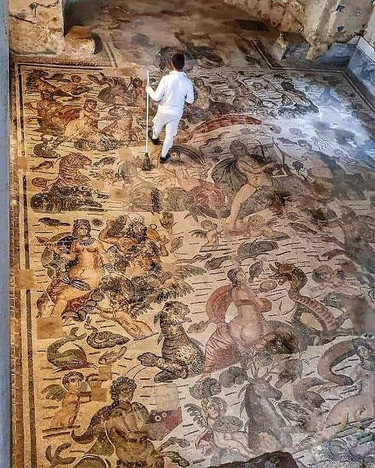 公元四世纪;古罗马马赛克地板,展示神话般的海洋生物和希腊神话中的人物,位于意大利西西里岛的罗马别墅德尔卡萨莱。