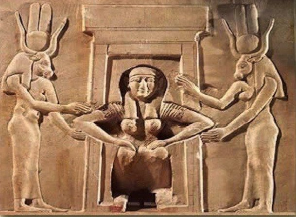 这块牌匾描绘了一名妇女在分娩椅上分娩,由两名戴着哈索尔头和王冠的妇女协助。哈索尔王冠由两个角和高高的羽毛组成,两个角之间有太阳盘。