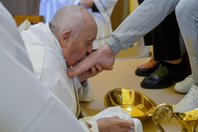 圣周四期间,教皇方济各在罗马监狱为坐在轮椅上的 12 名女性洗脚。 https://t.co/xeLDJpvywe