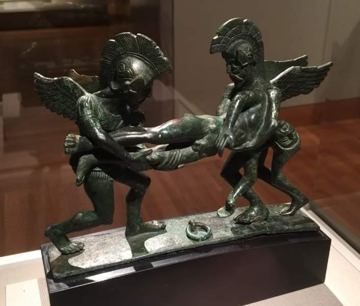 伊特鲁里亚青铜 cista(高大的圆柱形珠宝盒)的把手,公元前 400-380 年,描绘了许普诺斯(睡眠)和塔纳托斯(死亡)抬着被杀死的“戴着铜头盔的神一样的萨尔佩冬”的形象,萨尔佩冬是宙斯的儿子,在特洛伊战场上阵亡。