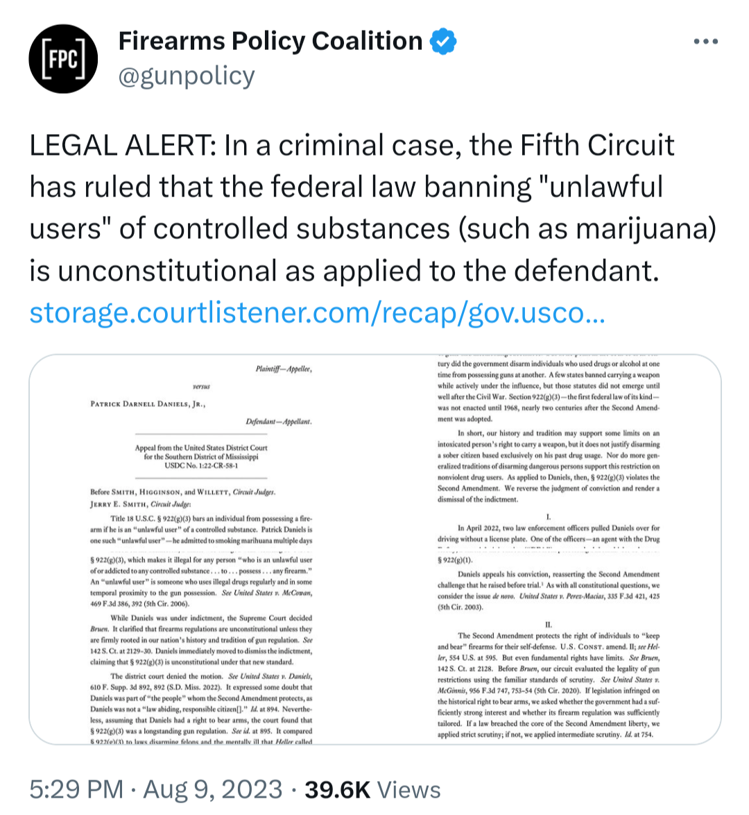 That an alcoholic could own a firearm but a pot smoker showed how it was always an unreasonable standard.