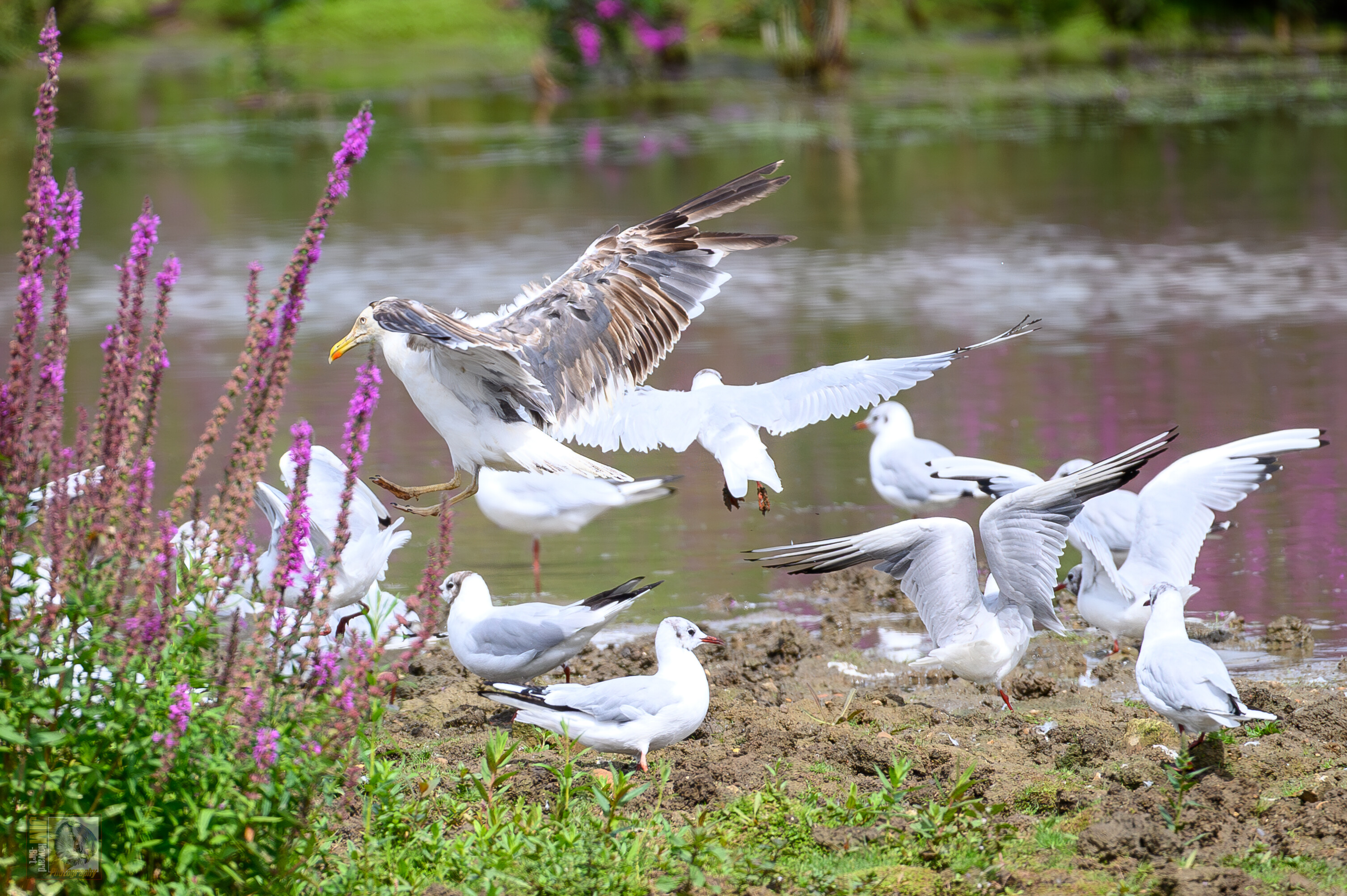 Marshland Madness as a large gull (again, not sure which type) lands amongst a group of Black-headed gulls