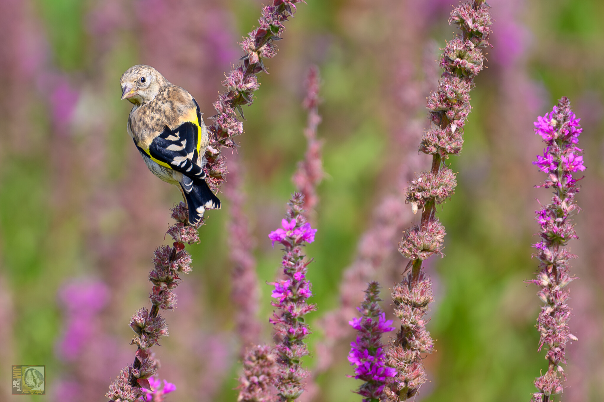 Here is a lovely Juvenile Eurasian Goldfinch on some purple/pink plans (possibly Lythrum salicaria - Purple Loosestrife)