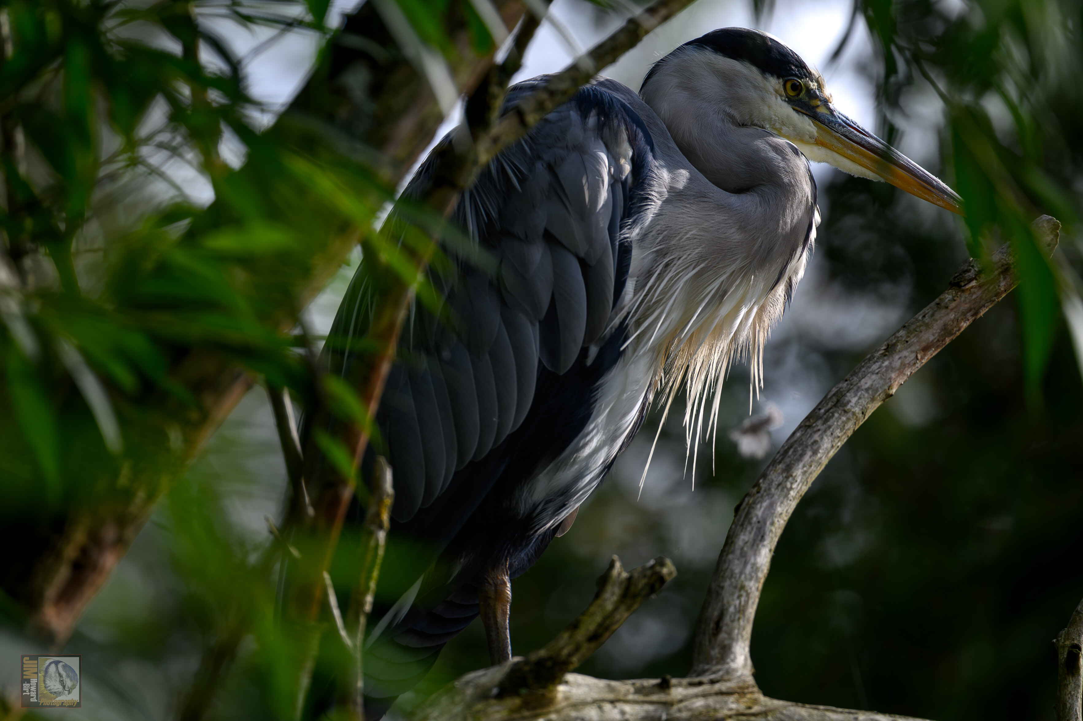 This Grey Heron was perched about 15ft up a tree and sat watching a fisherman below it maybe hoping for a free meal.