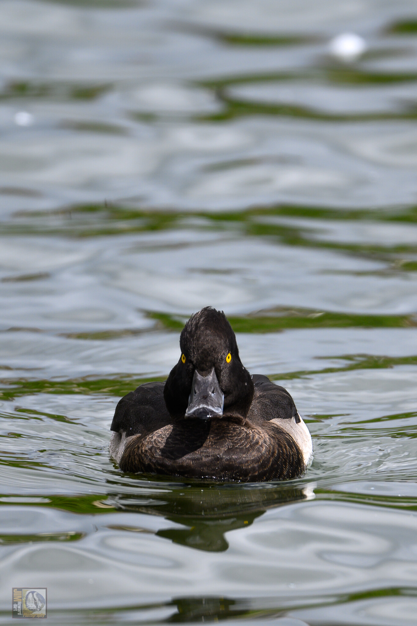 The tufted duck is a medium-sized diving duck that is smaller than a mallard. It has a black head, neck, breast, and back, and white sides. It has a small crest and a yellow eye