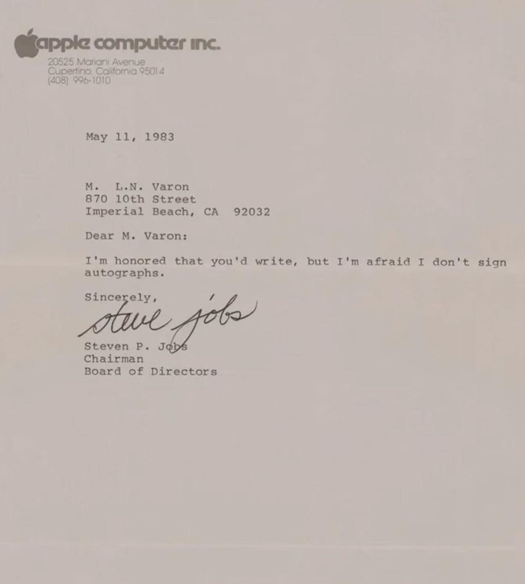In 1983, Steve Jobs sent this reply to a letter from someone asking for his autograph https://t.co/yWN9tEEzPj