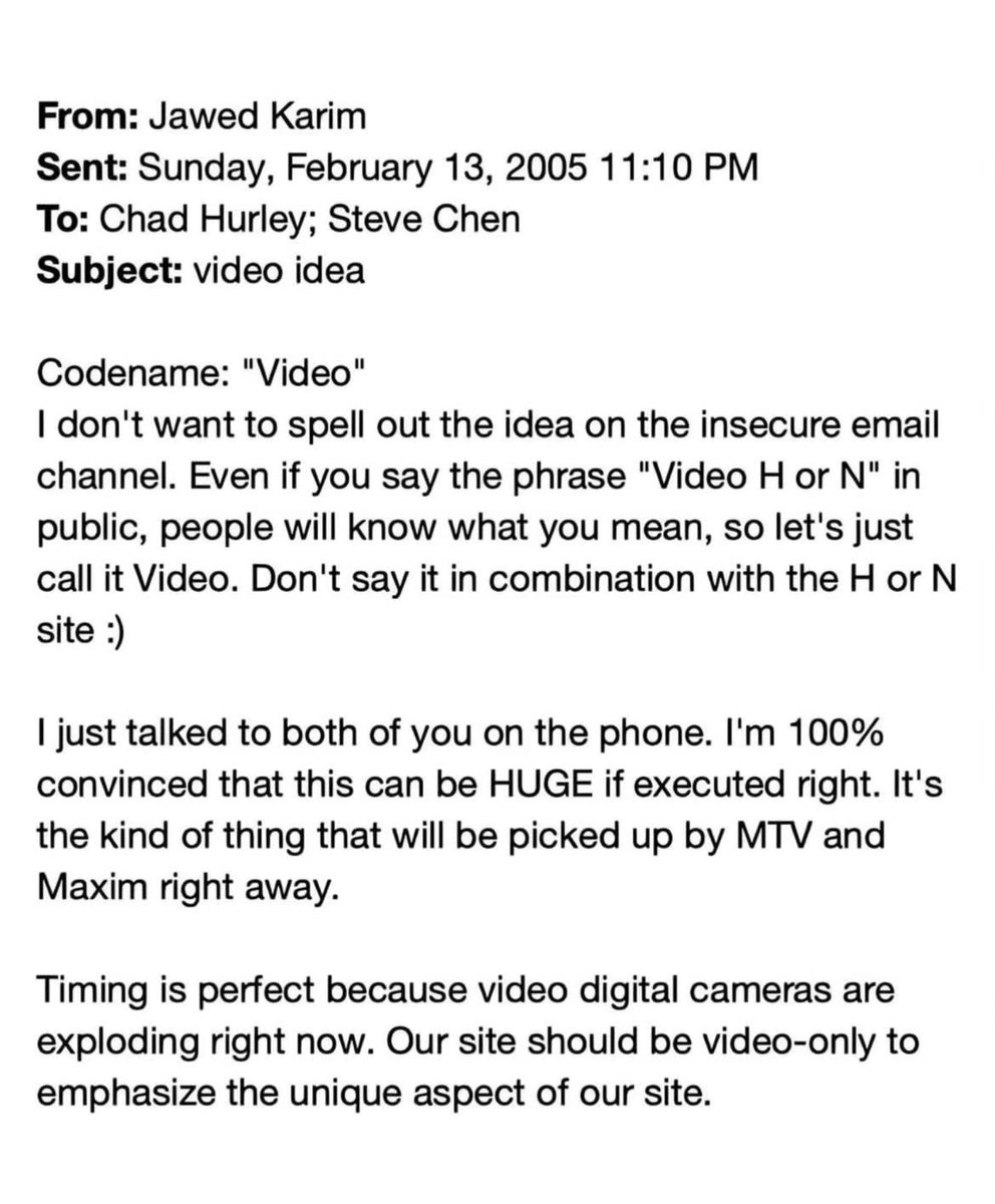 YouTube co-founder Jawed Karim's first email regarding YouTube's idea is going viral https://t.co/DvKNcmnduR