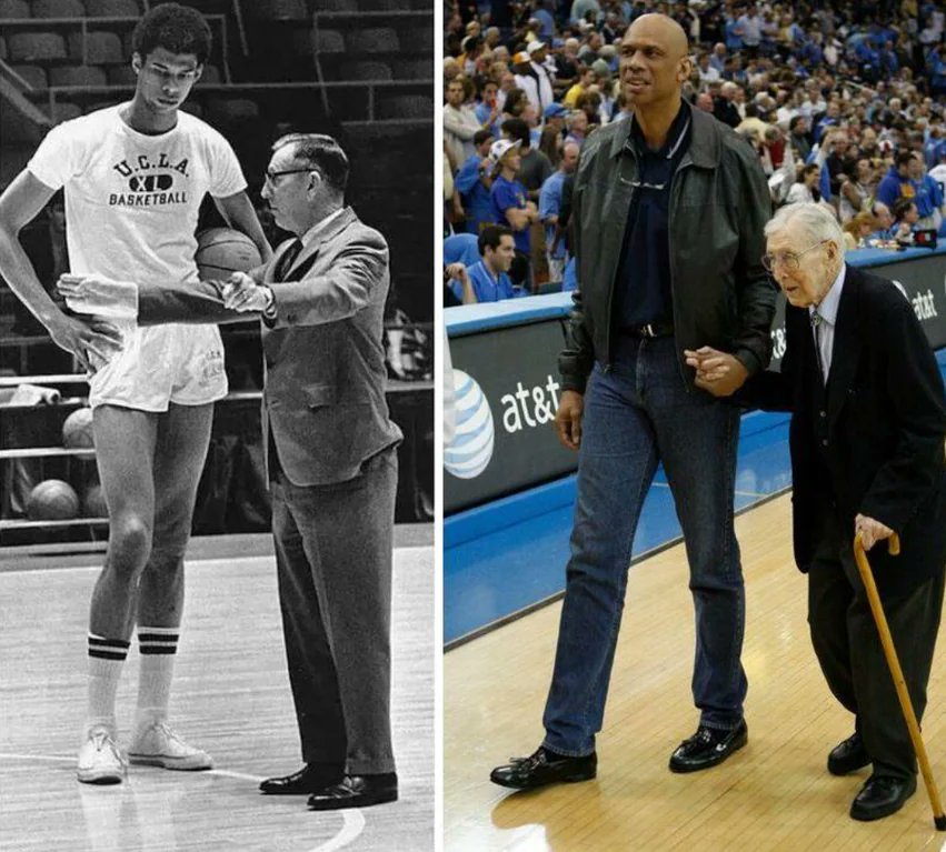 Kareem Abdul-Jabbar alongside his longtime coach John Wooden (1969) and 38 years later. https://t.co/HNPDHbH6hP