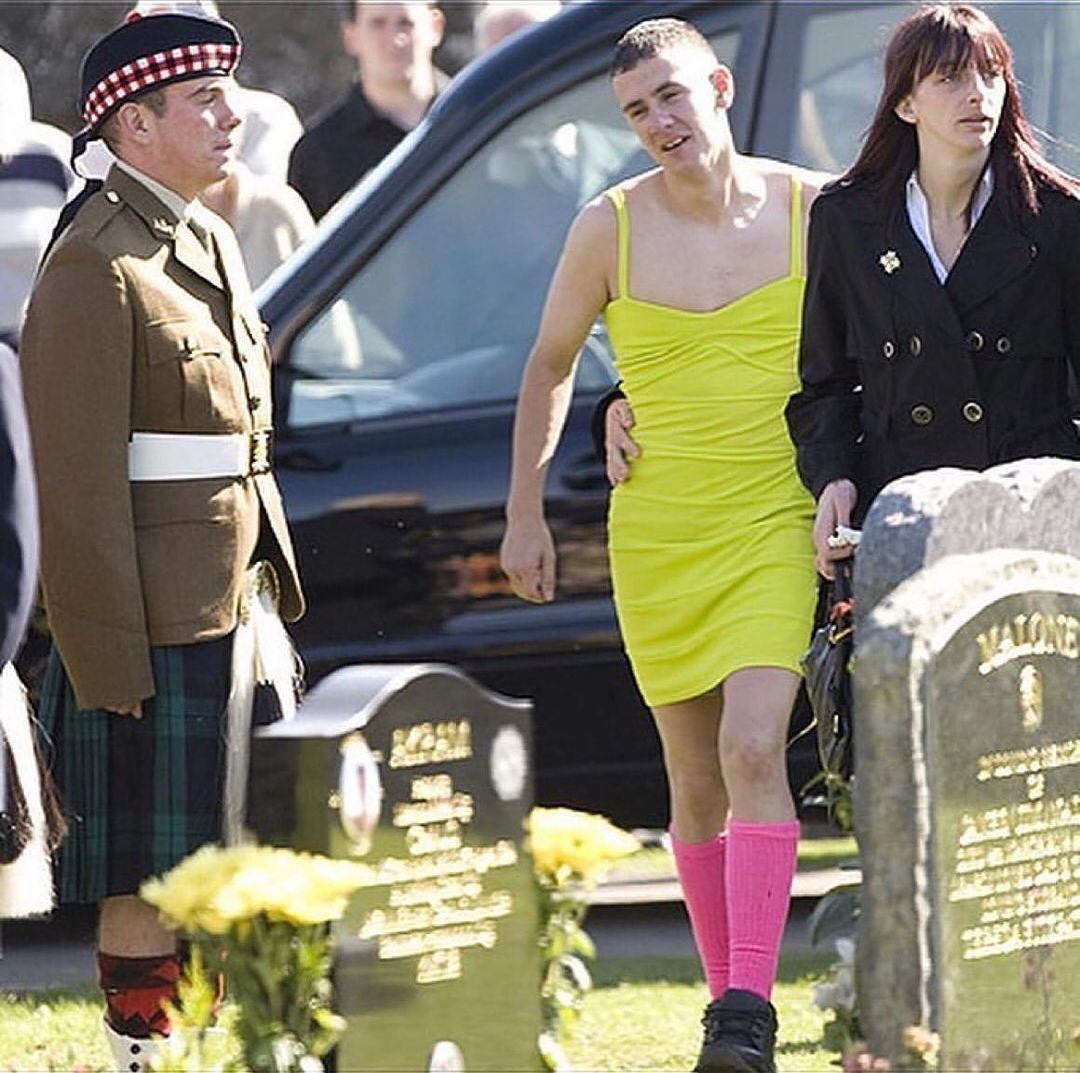 His best friend Barry Delaney wore a green dress to honor a long time agreement that if one of them dies, the other has to wear a bright green dress to the funeral. The ceremony was held in Dundee, Scotland.