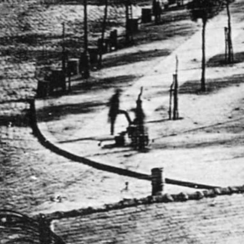 The image was taken in Paris at the Boulevard du Temple, a busy street. Due to the long exposure time required for early photography-around 10 minutes-the bustling street appears empty, as most people moved too quickly to be captured. However, in the lower portion of the image, a man getting his shoes shined stood still long enough to be immortalized in history.