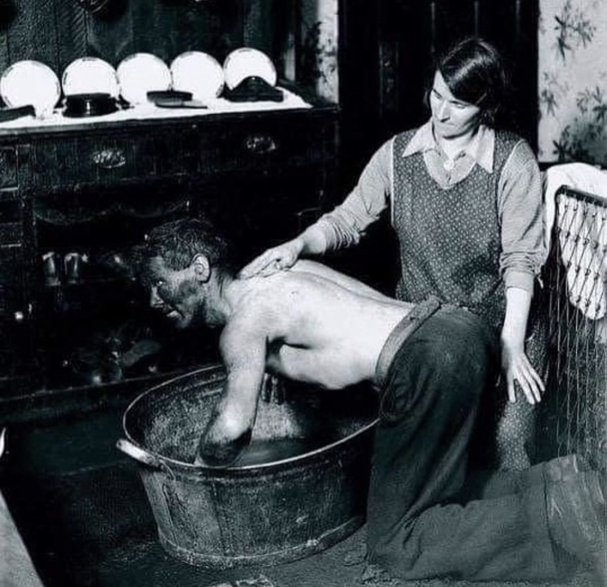 Wife helps wash her husband who has been working in the coal mines in Wales, 1931 https://t.co/yrFwPEDnBG