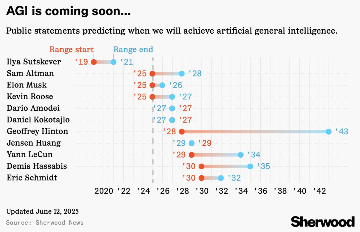 「VIPたちのAGI実現予想。発言ソースつきで公開されています。スツケヴァー氏の予測はずいぶん早かったのですね。」
