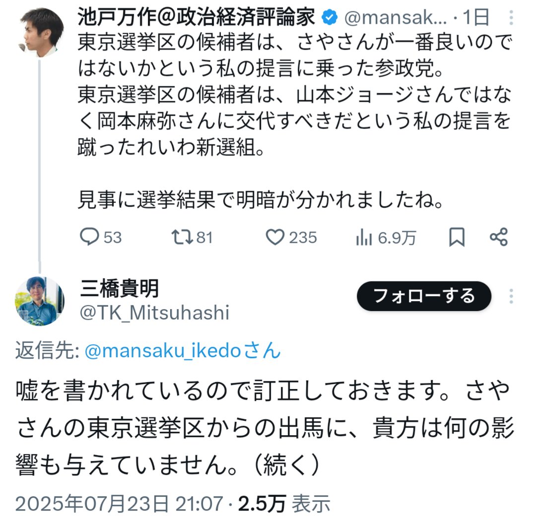 「【悲報】どっちがより「さや出馬に貢献したか?」、参政党さや応援団の池戸万作と三橋貴明、「さやの取りっこ」勃発💥