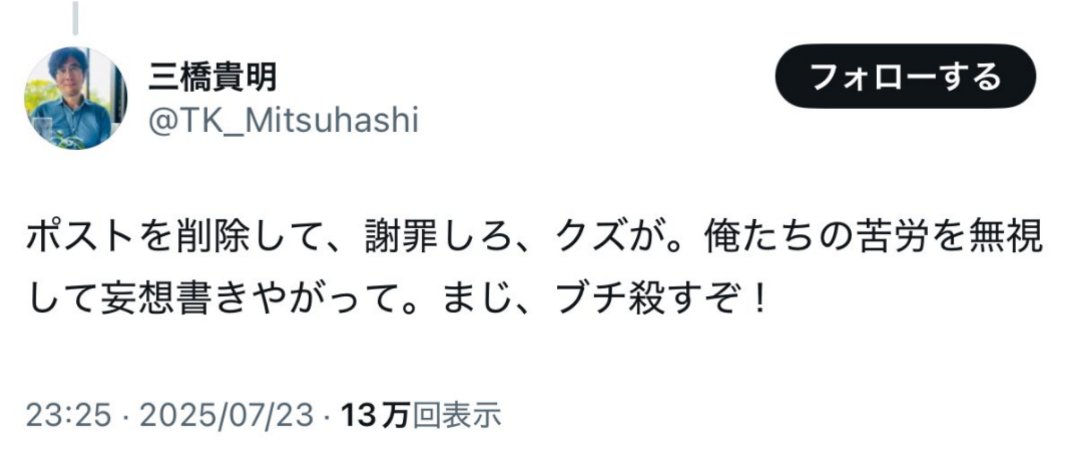 対面で、「ぶち殺すぞ!」ってほざいたならともかく、大衆の面前、SNSに実名で書きこんじゃう程度のちのーしか、感情で理性が吹っ飛んじゃうぐらいのEQしかないからさwwwみちゅはしは。もはや哀れですらあるわな。