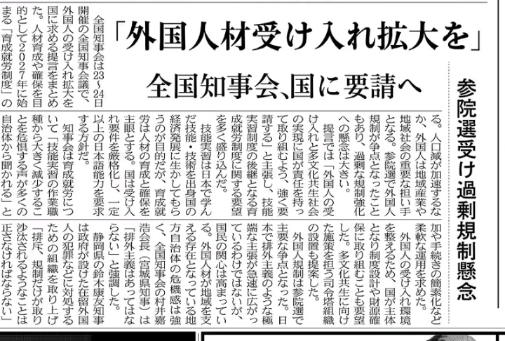 「参政党支持のみんなぁー!全国知事会が外国人受け入れ拡大を要請だって♪つまり、外国人がガンガン入る要因はぁー、各県知事、、、の後ろにいる、支援者たる、地方の企業や農家が原因ってわけ!だから過度な外国人対策には?、、、地方の企業や農家どもを徹底的叩け!!!」