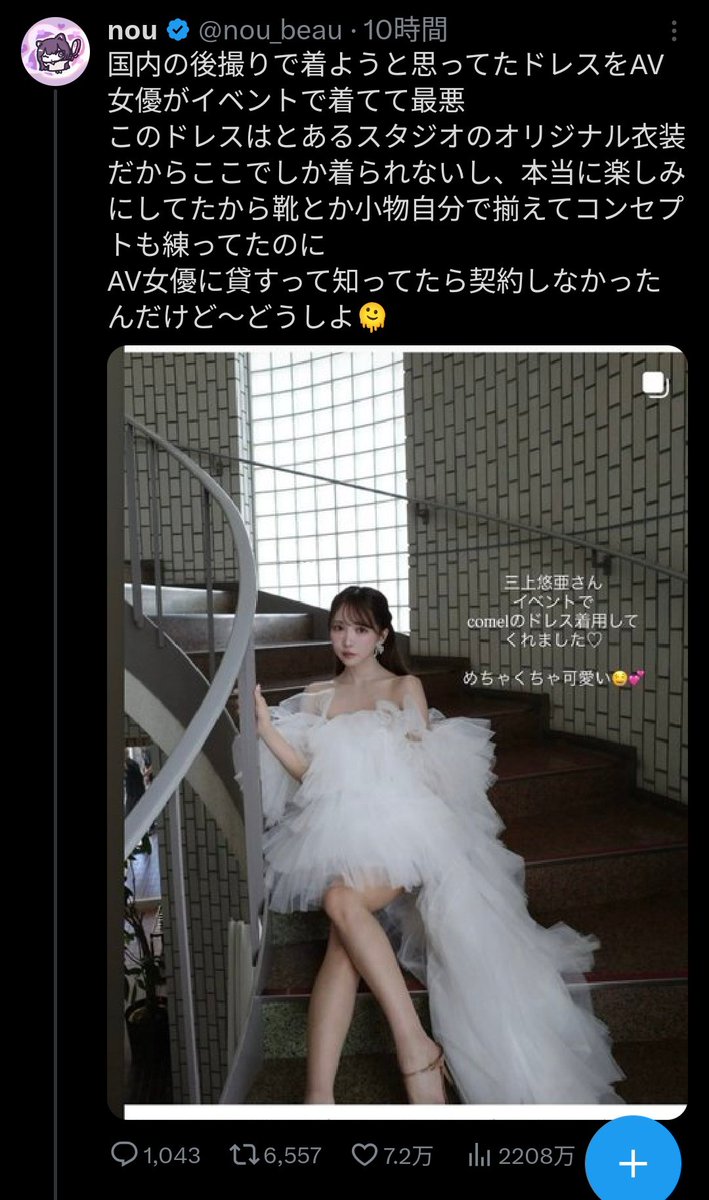 「「AV女優が使ったドレスは着たくない」は「黒人の泳いだプールには入りたくない」と同じだよ。まともな人間なら口にはしない。」