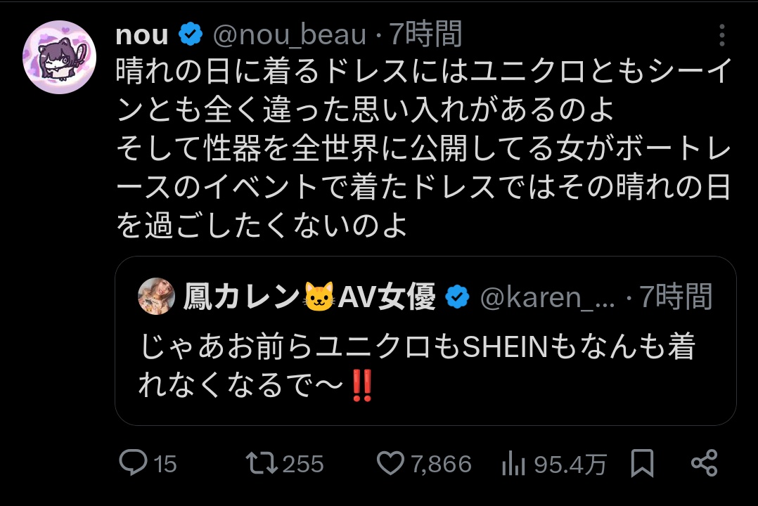 「この最初の投稿に7万もいいね付いてるのもすげえけど、その後の投稿で性器を全世界に公開してる女とかナチュラルに言ってるの、人権侵害職業差別どころじゃなくて個人に対する誹謗中傷だろこれ
