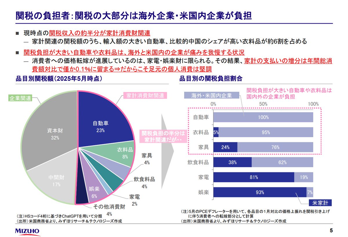 「みずほによる誰が関税を負担しているのかという設問にこたえるレポート。知りたいと思っていたことがたくさん書いてあった。自動車は100%企業が負担しているがこれがたとえば家電だと19%になるそうで、同じ耐久消費財でも驚くほどの違いがある