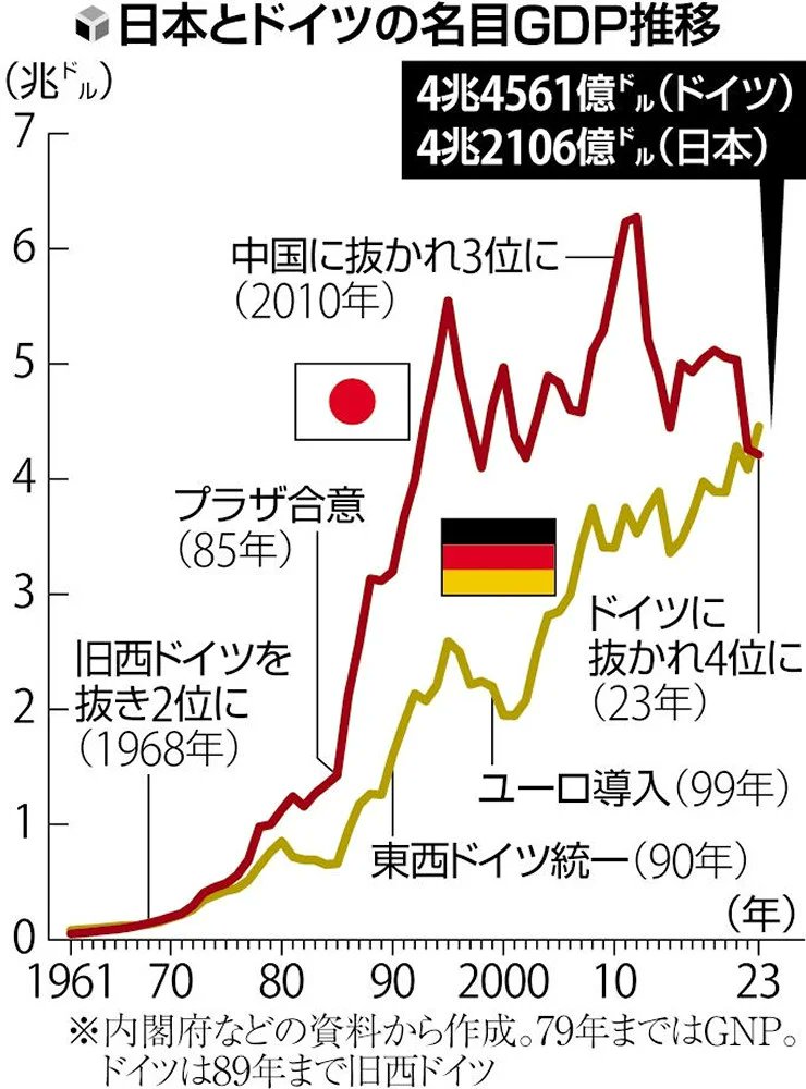 「アベノミクスが成功してたらドイツにGDP抜かれていない。グラフをみると、民主党政権時代に跳ね上がっているのは為替影響だとしても、その後低迷しているのはアベノミクス そのものの失敗のせいといえる。」
