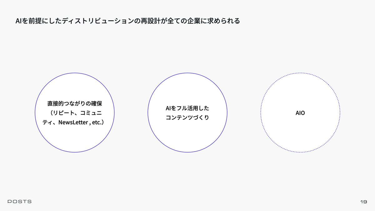 「日本ではまだそんなに深刻化していないけど、英語圏ではチャットAI、検索時のAI要約によってWebサイトのトラフィックが激減しており、ディストリビューション戦略の再設計が急務になっている。