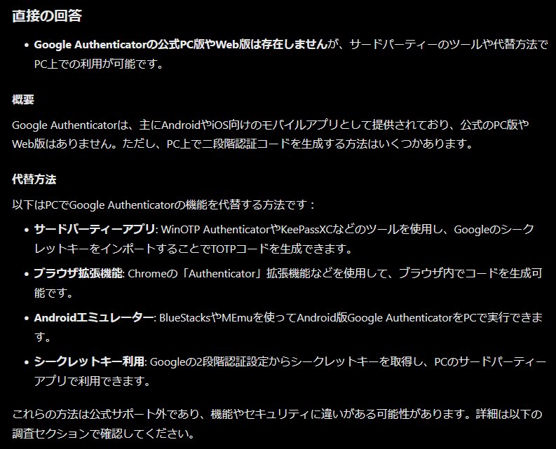 そいや、ぐぐる先生のauthenticatorのPC版?WEB版とかでもいいが、スマホ以外の者はあるのかな?(´・ω・`)