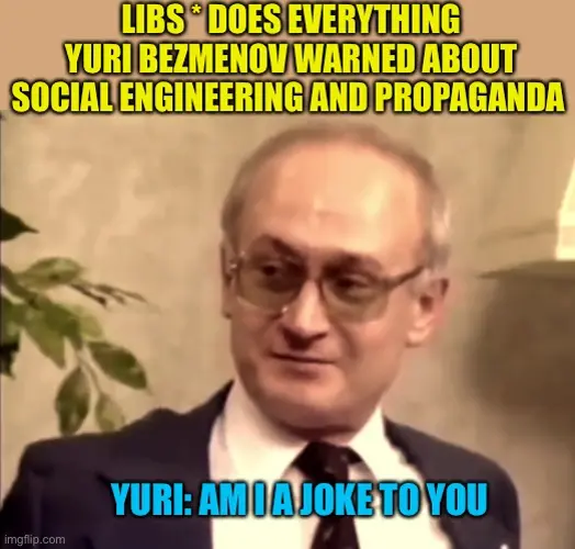 You can shower left and woke all day with facts that are just and truthful, always will be rejected in modernity woke clown times. 1984 Yuri Bezmenov ~Former KGB Spy of Soviet union.