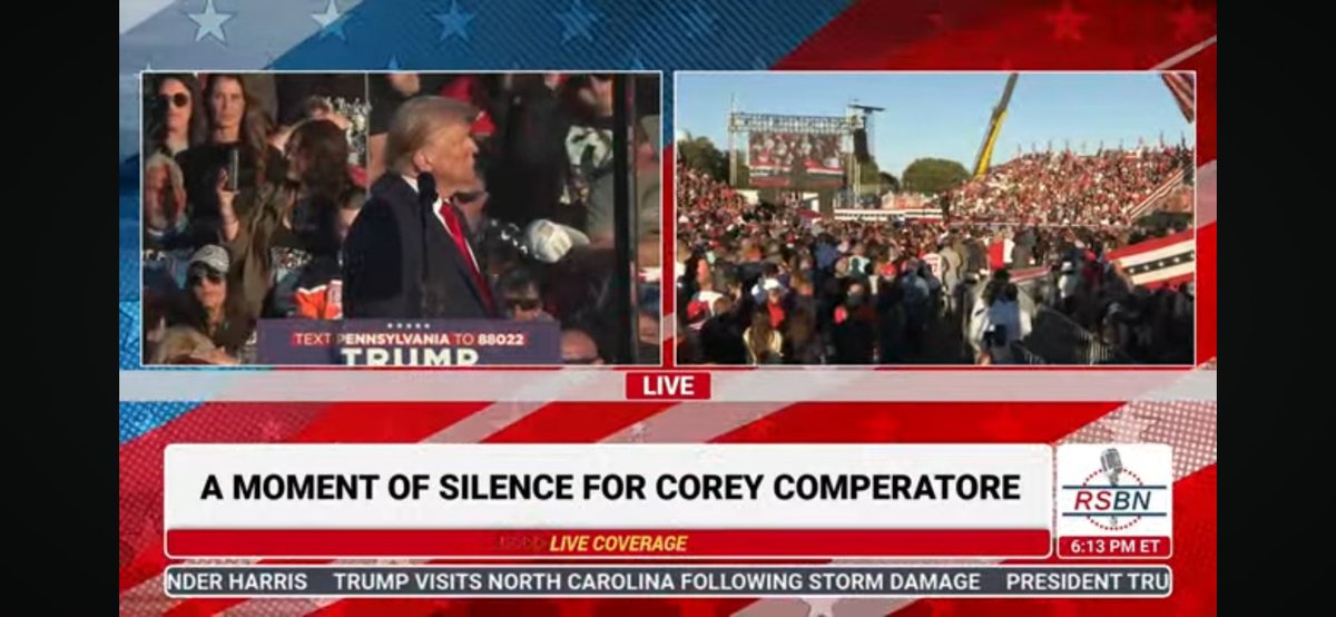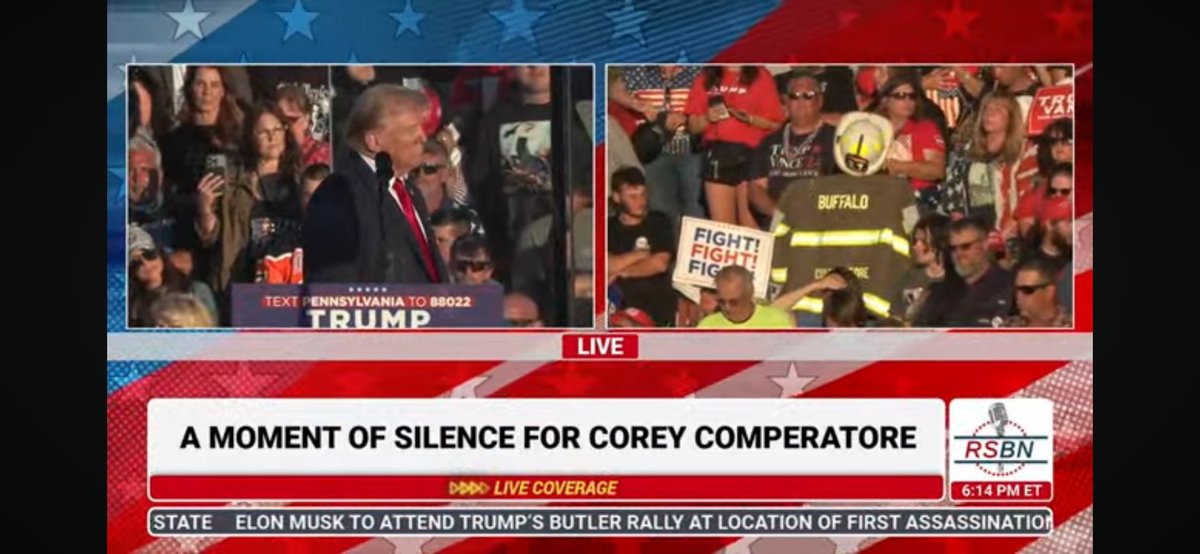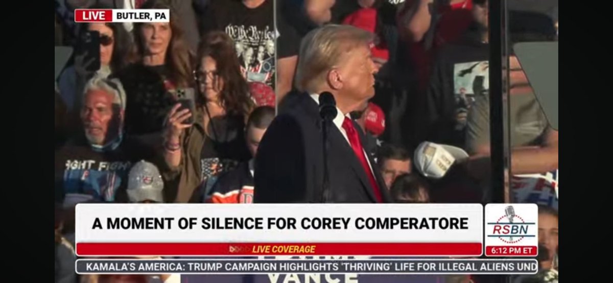 刚刚在宾州巴特勒市的集会上,川普总统请全体民众起立,为在7月13日罹难的前消防队员科瑞致哀。川普总统目视着科瑞当时的位置,优美深情的男高音缓缓唱出挽歌《玛丽亚》。