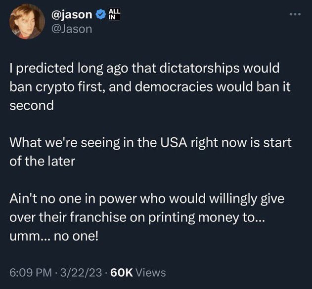 Come on fam. Even Peter and Doomberg are being more intellectually honest about these scenarios. We’re not going to hit critical mass without addressing these issues and beating up solutions. Jurisdictional optionality seems like the obvious win but there currently isn’t an easy path for the average Joe. So are we just gonna succumb to the inevitable tyranny and watch em all bleed out while we sip margs in ElSalvador?