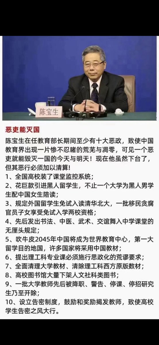 📣 这个教育部长陈宝生和江贼民时期的陈至立比较一下:自上世纪90年代江贼民推行“贪腐治国”政策,陈至立上任教育部长后也相应搞出“高校扩招”和“教育产业化”。