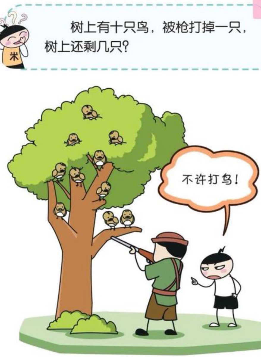 问:一棵树上有10只鸟,用枪打下来了1只,还剩多少只?