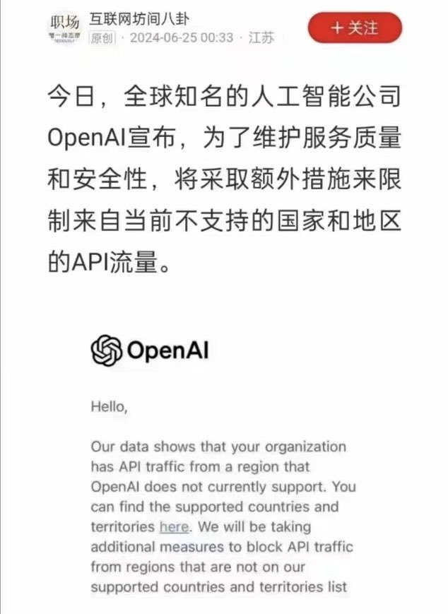🔥【突发】OpenAI宣布终止对中国、俄罗斯、朝鲜、伊朗等独裁国家提供API服务! https://t.co/ZAENN1x4oc