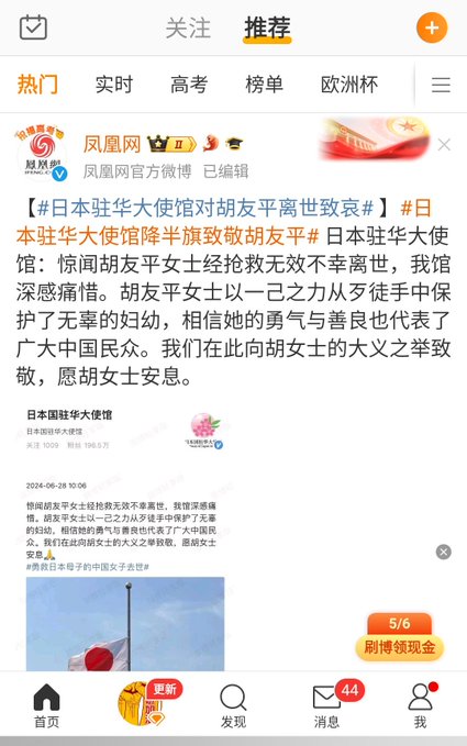 🔥對女英雄的逝世,日本駐華大使館下半旗致哀!