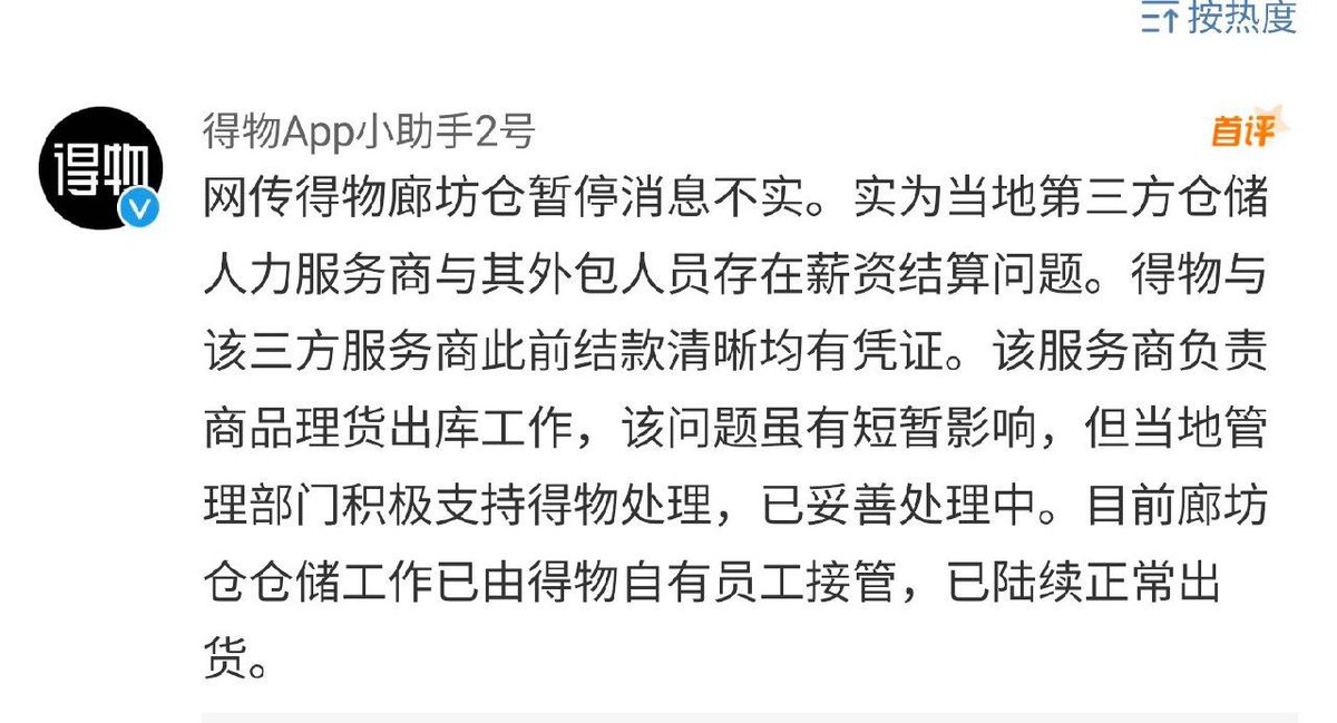 👇得物回应:网传得物廊坊仓暂停消息不实,实为第三方人力服务商与其外包人员存在薪资结算问题! https://t.co/UcgqFvExig