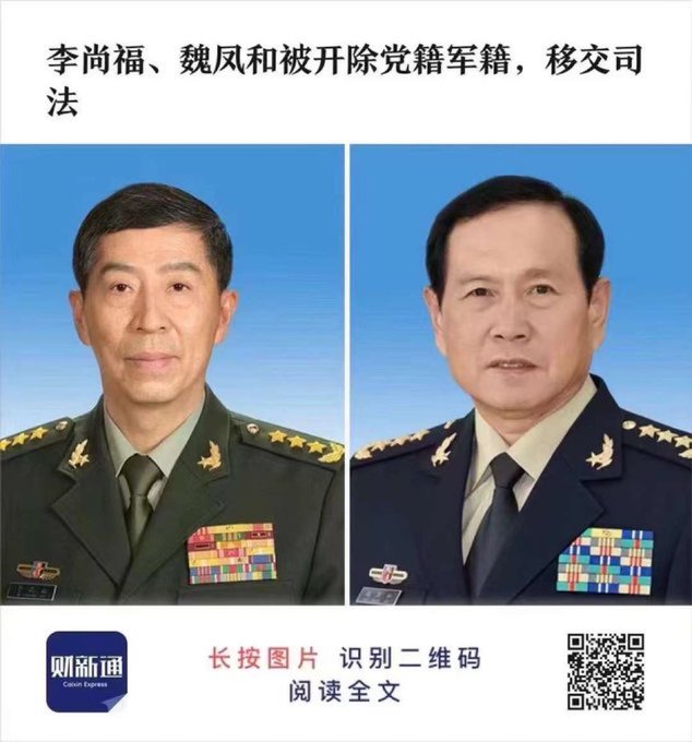 🔥 匪共中央政治局开会决定,将魏凤和、李尚福两名前国防部长开除党籍,并将两人移送军事检察机关,审查起诉。