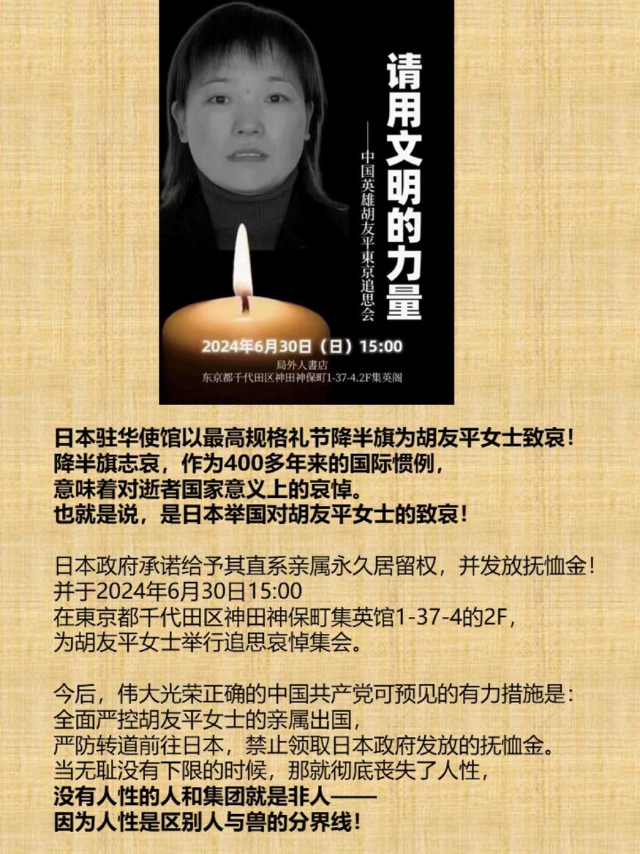 🔥 日本驻华使馆以最高规格礼节降半旗为胡友平女士致哀!
