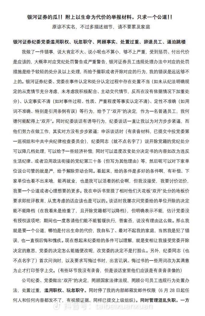 🕯️#银河证券 研究院化工行业首席分析师 #任文坡 留下《以生命为代价的举报银河证券党委纪委的材料》后跳楼自杀‼️
