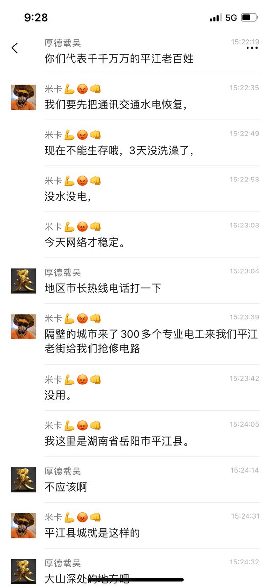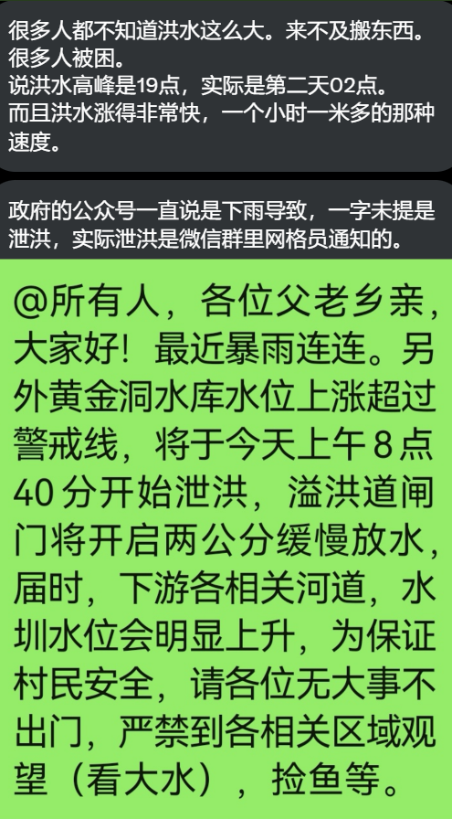 现在没有电没有水,前期政府封锁网络,信息都发不出来,没有救灾人员,没有救灾物资,百姓困苦不堪。7月5日,湖南平江县。一位灾民发视频称,从1日受灾至今已有5天,只领了六桶方便面和几瓶矿泉水。没有看到一点米和油。“感谢平江领导泄洪导致的结果”