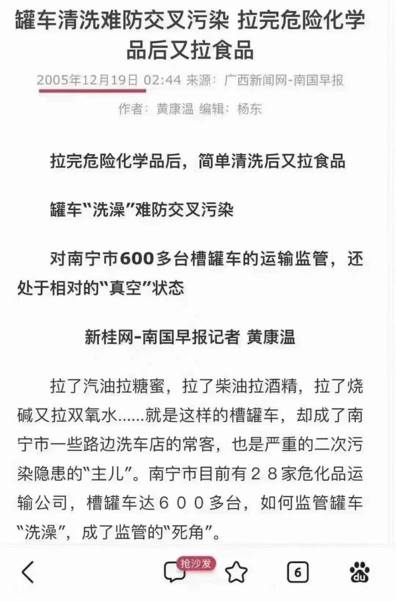 图三:2005年广西新闻网《南国早报》就报道了槽罐车转运食用油、矿物油、化工原料、污染废水等从来不洗车或区分车辆使用!但未引起中共政府重视!