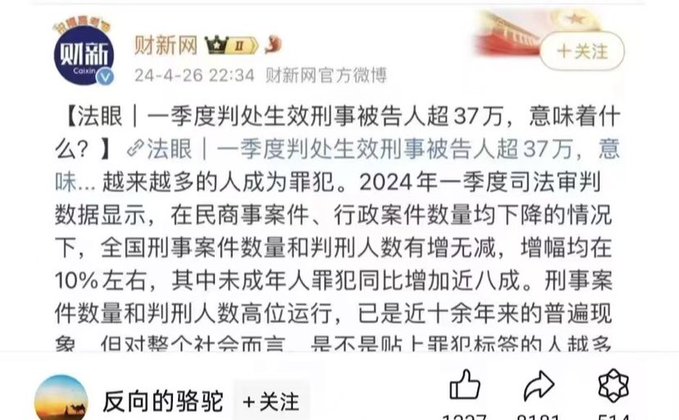 👉 财新网:据统计中国仅上一个季度发生了37万起刑事案件,也就平均每天发生4100起刑事案件,近24年来,刑事案件数量翻了三倍‼️