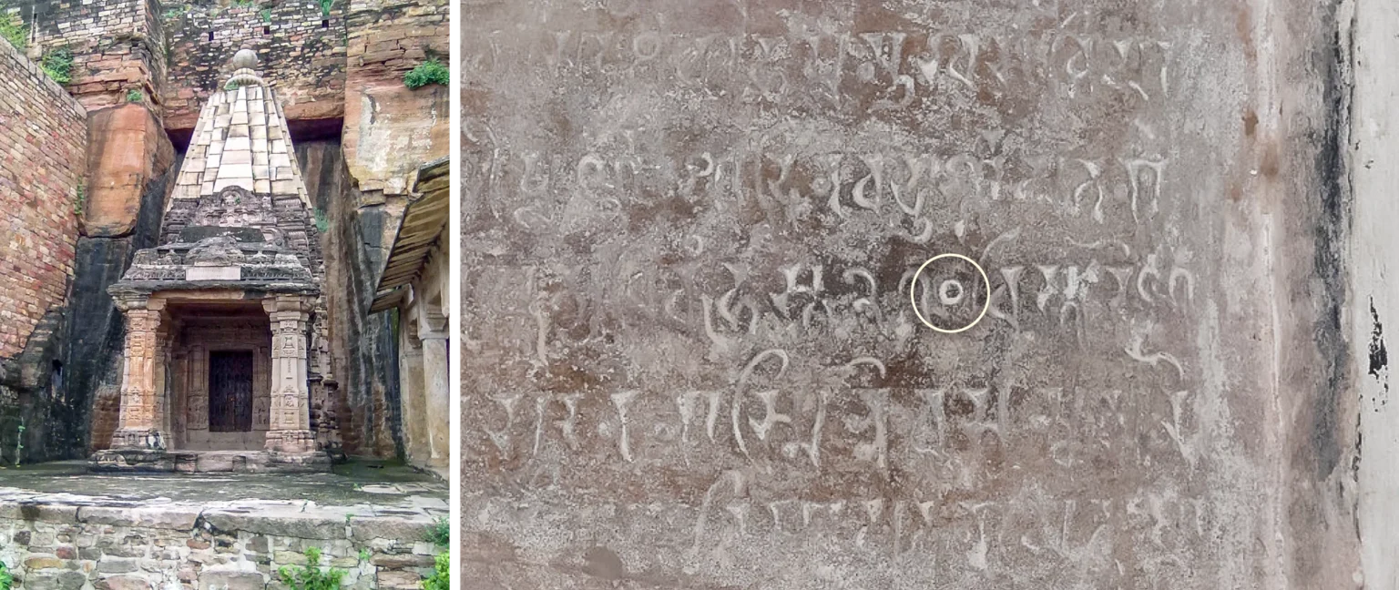 Inside the Chaturbhuj Temple in India (left), a wall inscription features the oldest known instance of the digit zero, dated to 876 CE (right). It is part of the number 270.