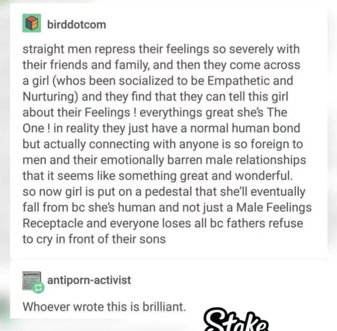 Just putting it out there since contemplating the truth that every species performs behaviours unique to the species in order to pursue and succeed at reproduction. What does the human species present? Oh, well, the push back from male regressive conservative misogynistic thinking now make a lot of sense. The only way males secure incubators for their sperm has Always been successfully decieving the female, long enough to capture and often long enough to condition, do spirit breaking, make her serve the male for the best interest for herself. And him. This is the unique violence the human male exhibits to secure a reproductive mate.