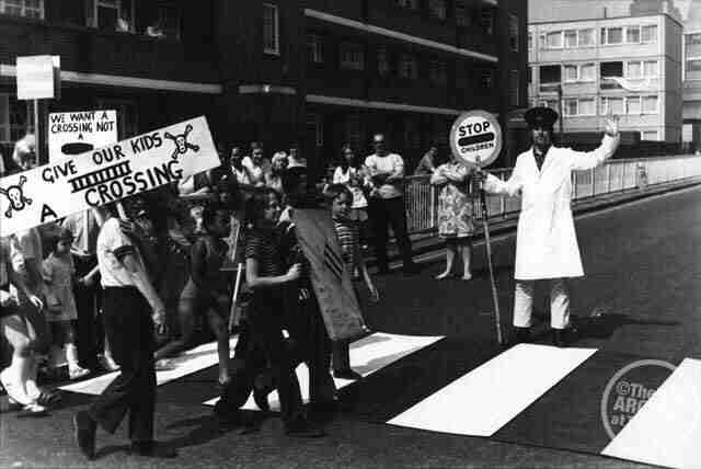 Keith Moon campaigning for a new crossing on Thessaly Road, 1972.