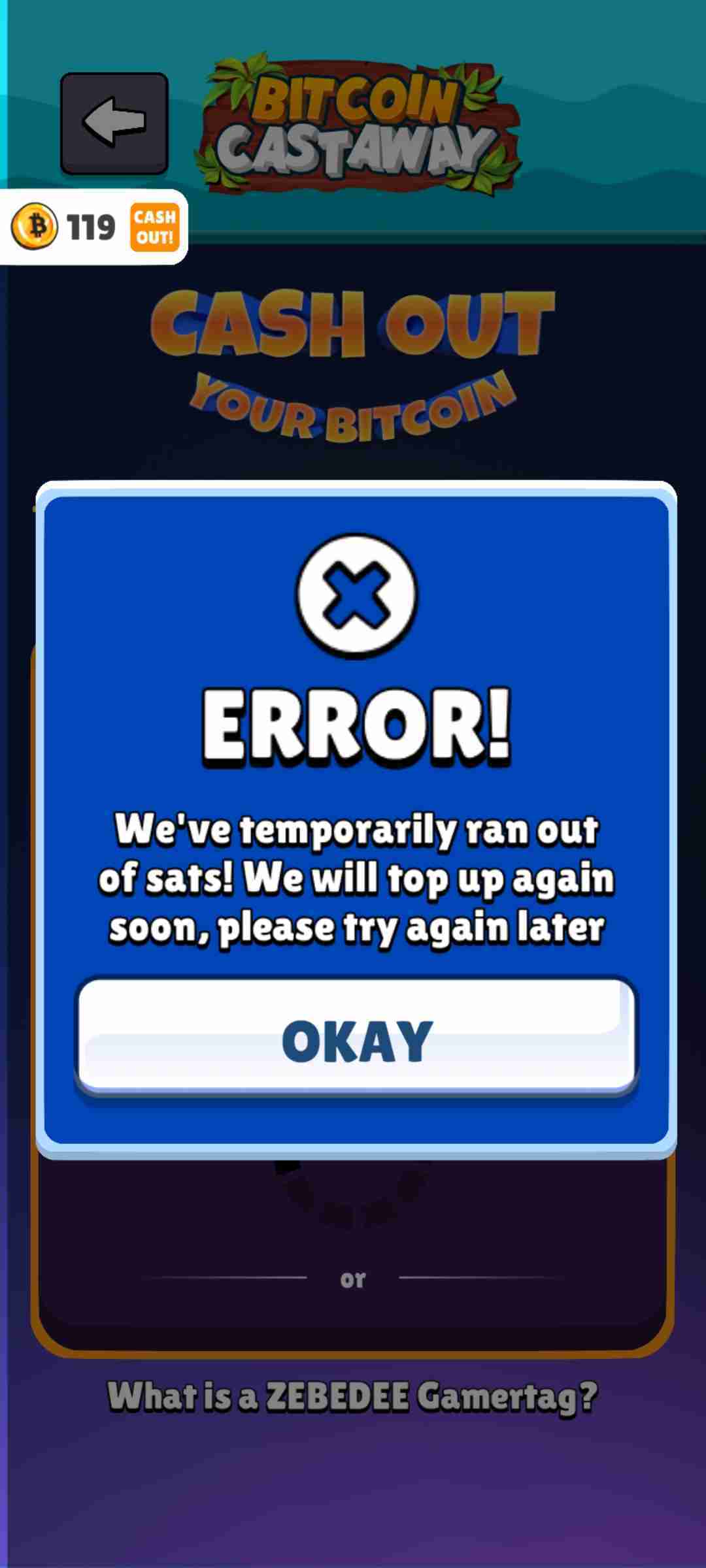 @ZBD team, look at this today it's the second day when it's happening, in my opinion you should stop promoting this games it's impossible after you see so many ads that you can't withdraw sats from them #ZBD
