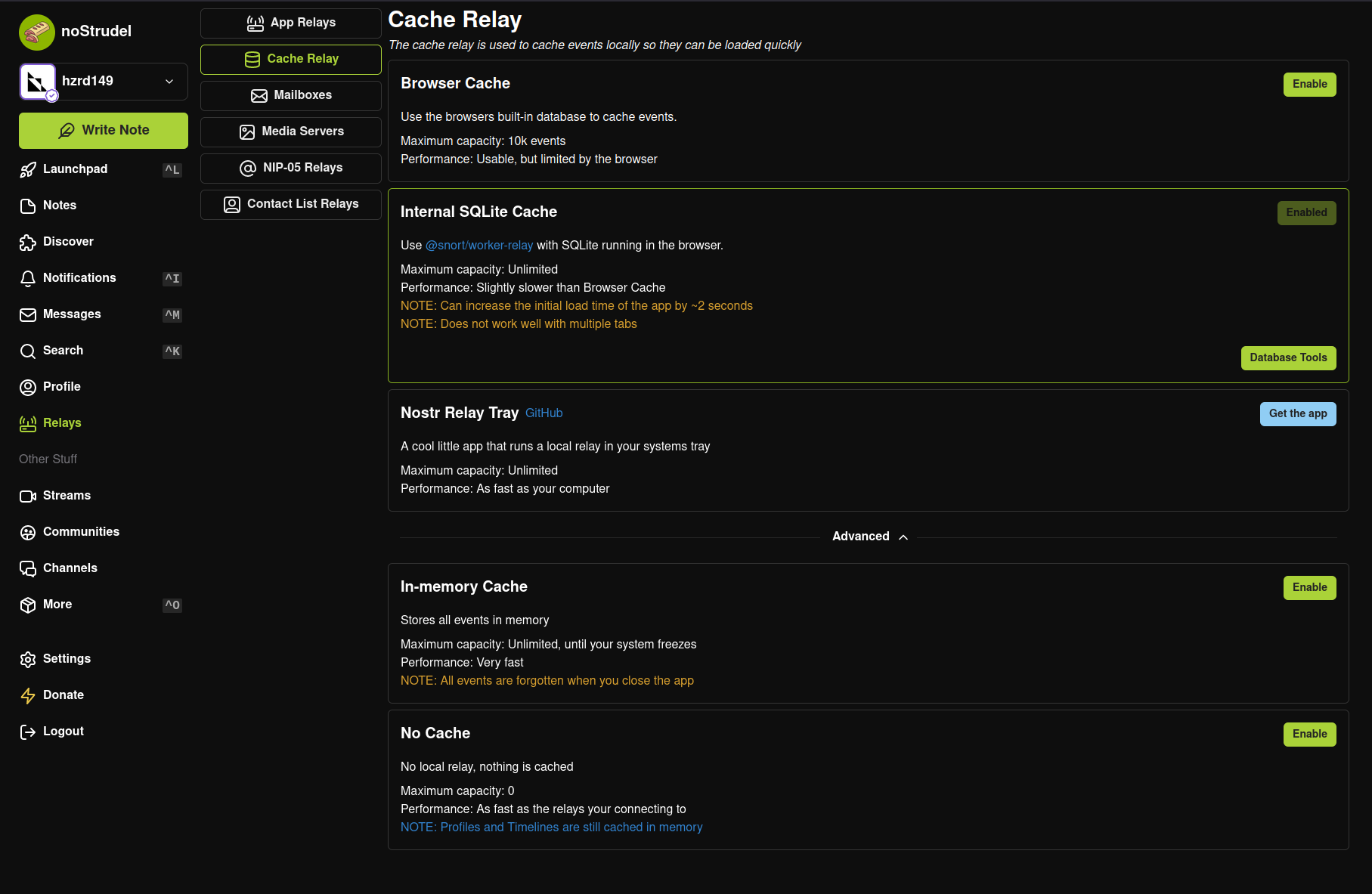 The No Cache option disables the local relay cache. however profiles and some timelines (notifications, feeds) are still cached in memory