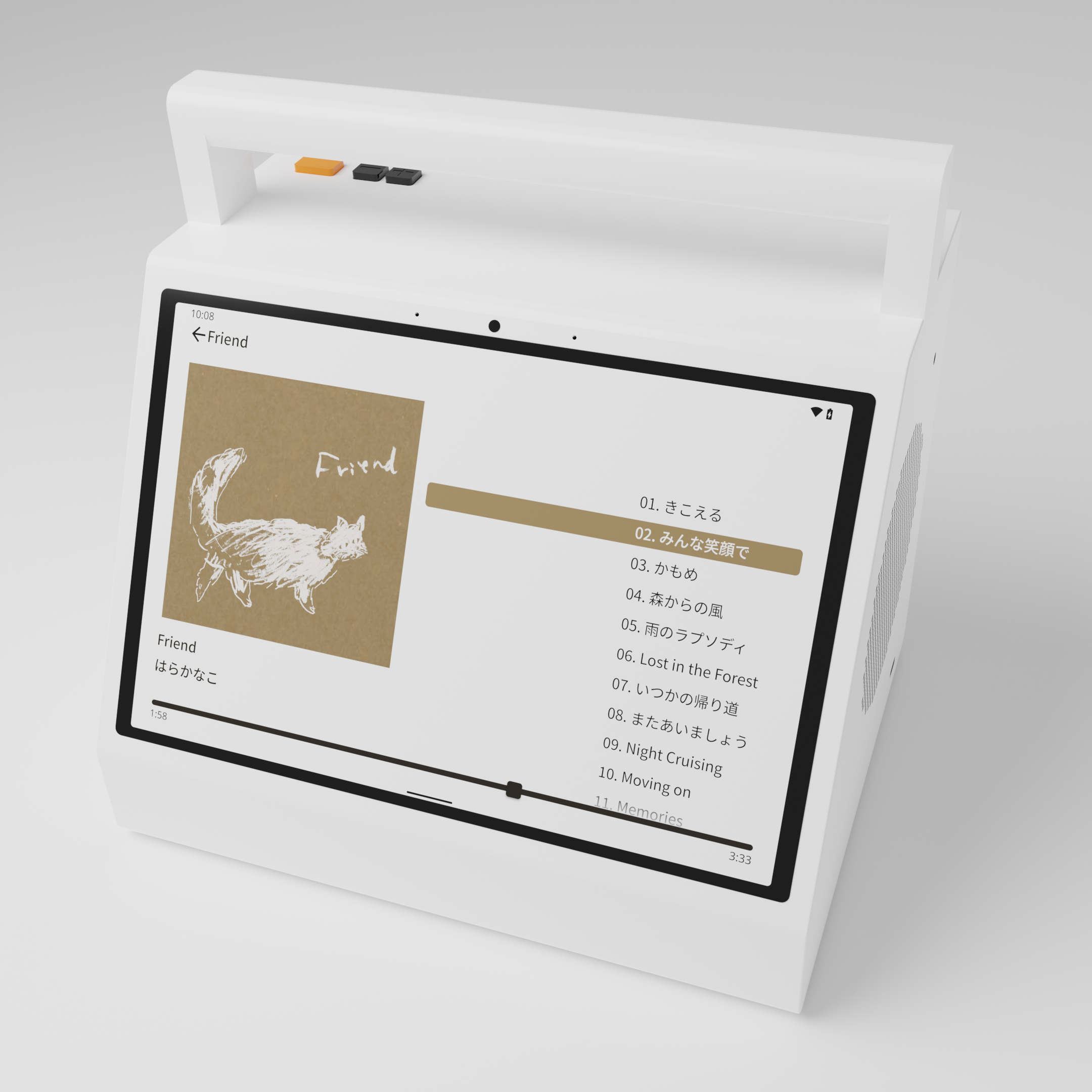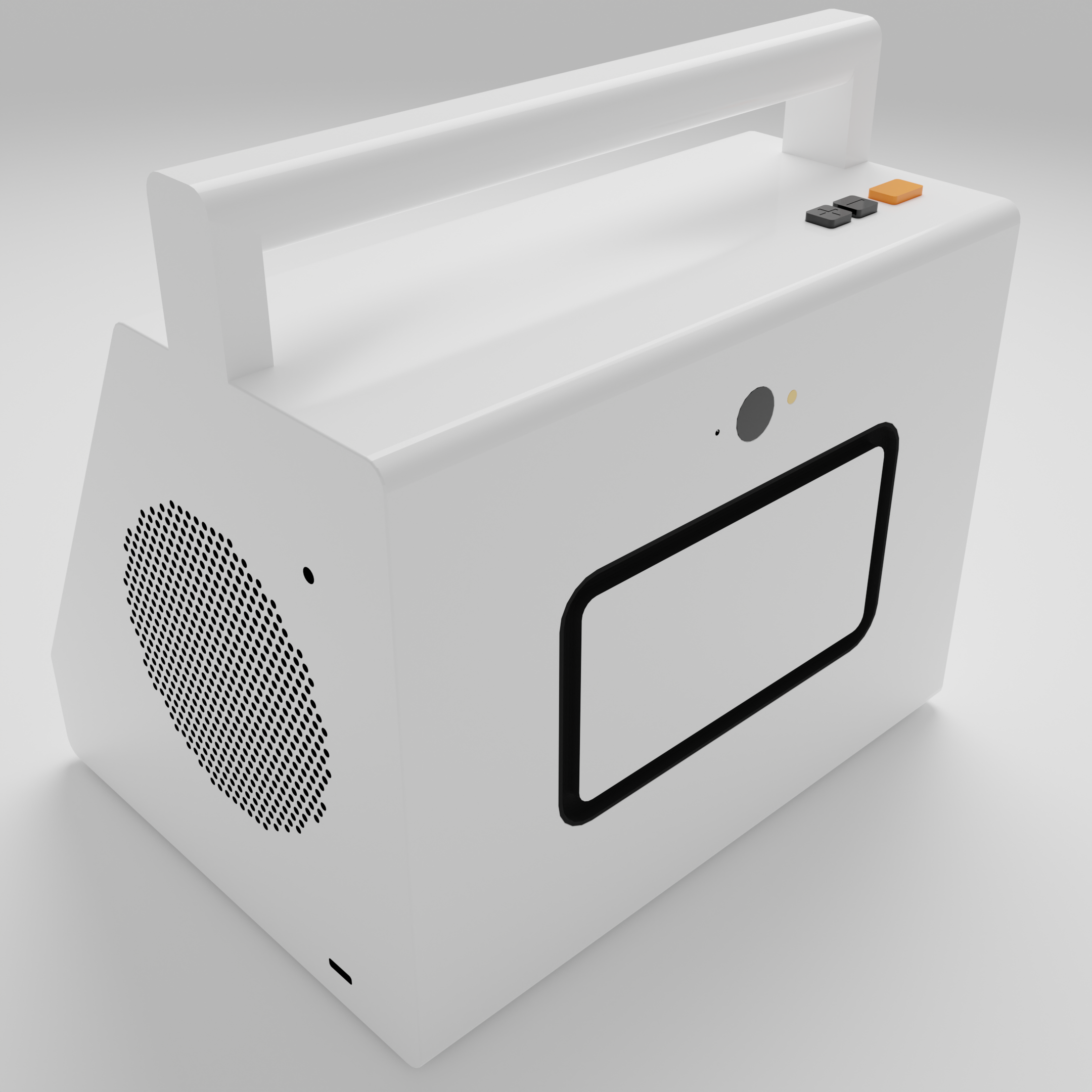 最初はラジカセのカセット部分にタブレットがあるようなものを考えてた。持ち手は欲しい。音ゲーとかしたいので普通のAndroidが動く。上にラジカセっぽい電源ボタンと音量ボタンがある。横にType-Cソケットがある。ただ、スピーカーグリルが圧迫感があった。